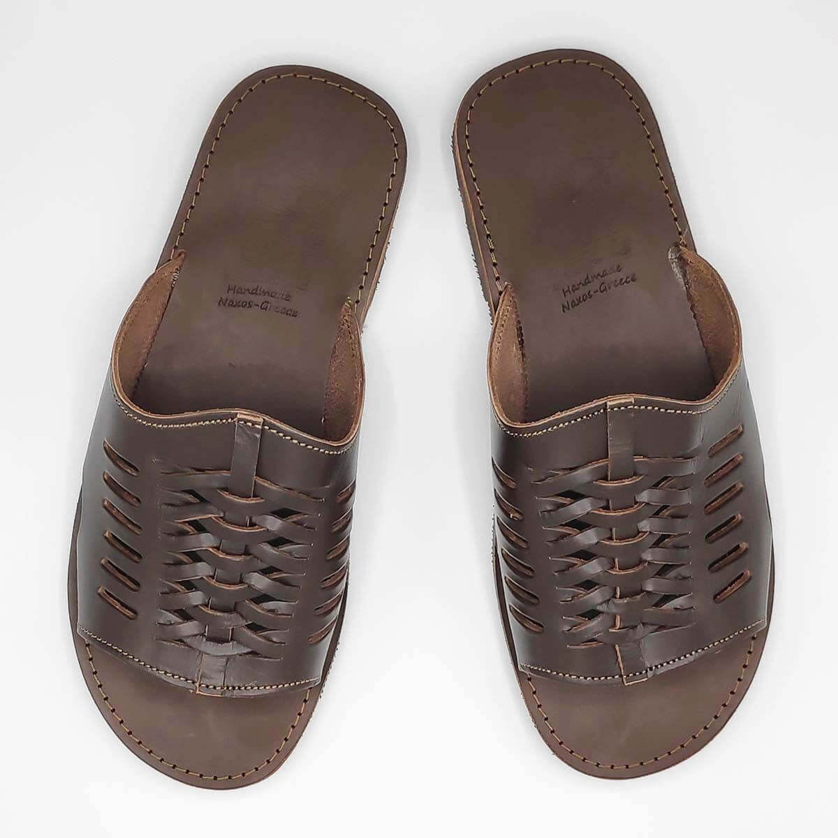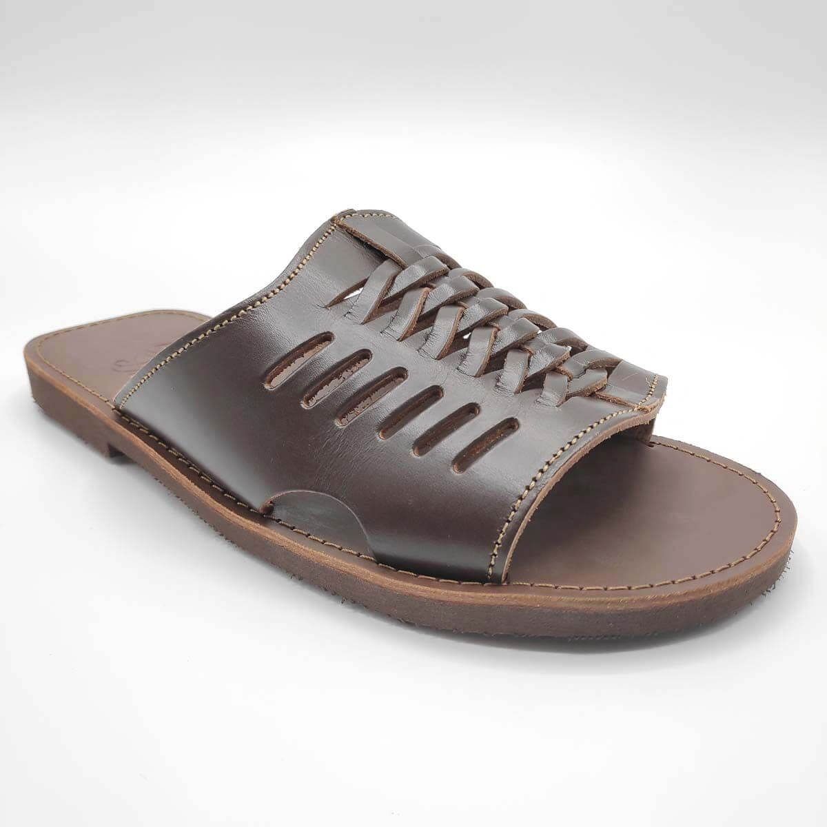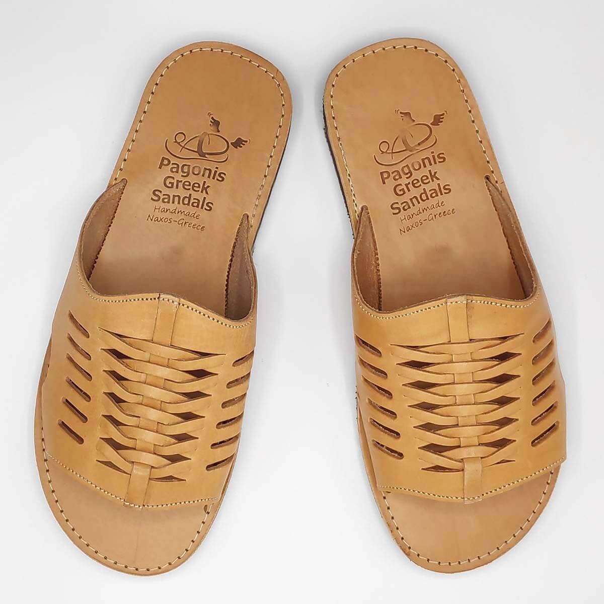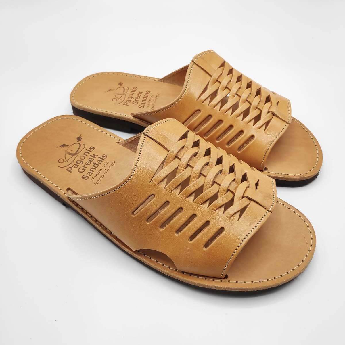 Slip on mens leather sandals in Natural and Brown Color. A classic men’s slide with an interesting design. Matches with casual or more sophisticated outfits. Handmade in Greece with the best material. Making leather sandals the last 30 yeats. Pagonis Greek-sandals.