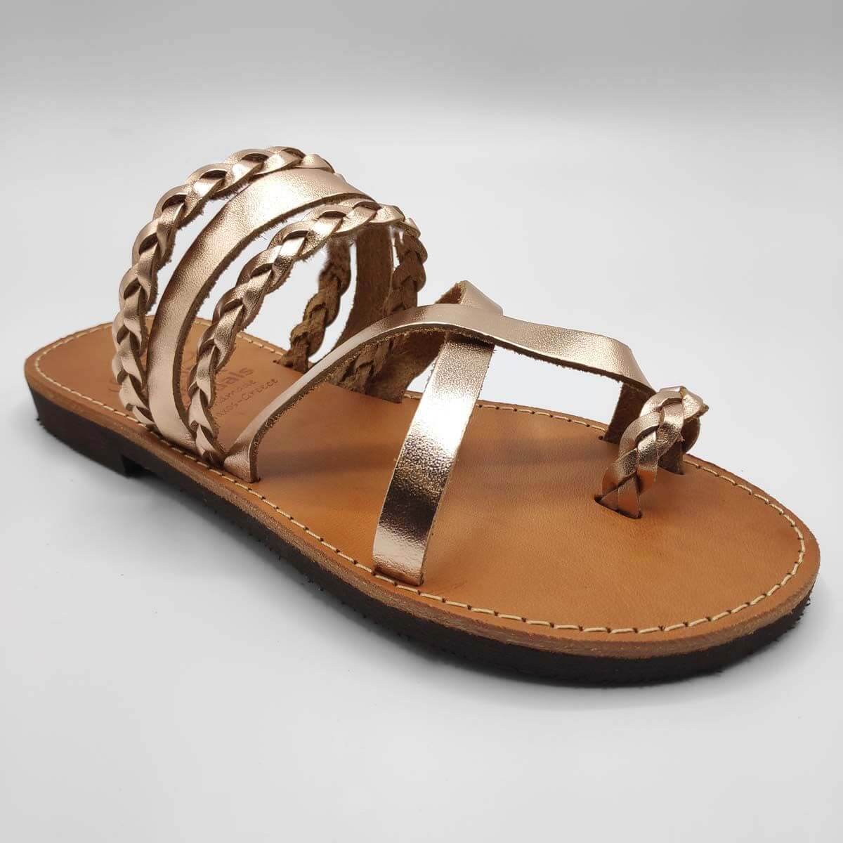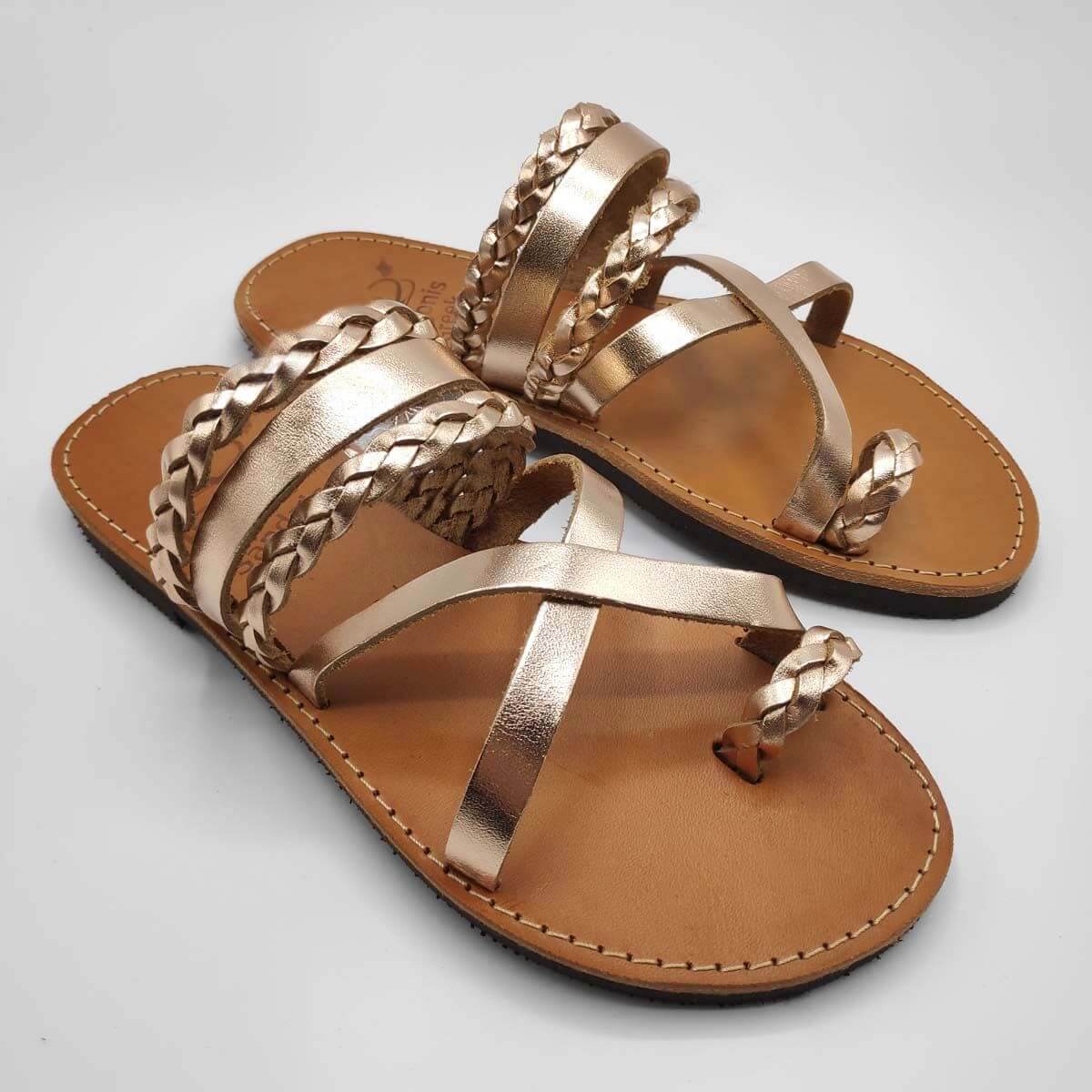 Braided Leather Flat Sandals, Handmade Leather slide with braid straps. Shop Online – Available in 3 Colors. Natural Brown & Brass (rose gold)