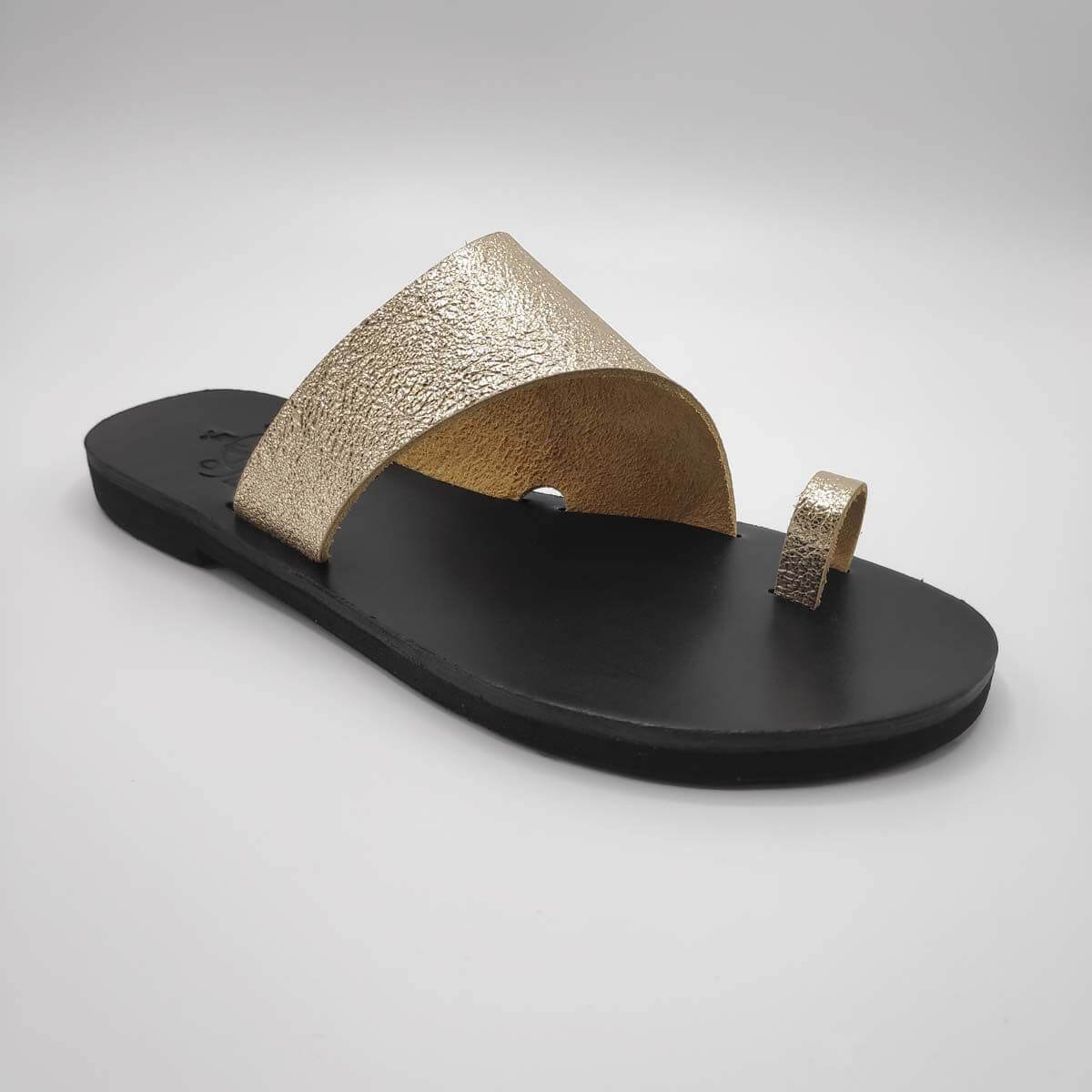 Toga style leather sandal with toe ring designed with a big toe ring and curvaceous asymmetrical top foot leather strap. The straps are set on a leather upper sole for comfort and a rubber bottom sole.