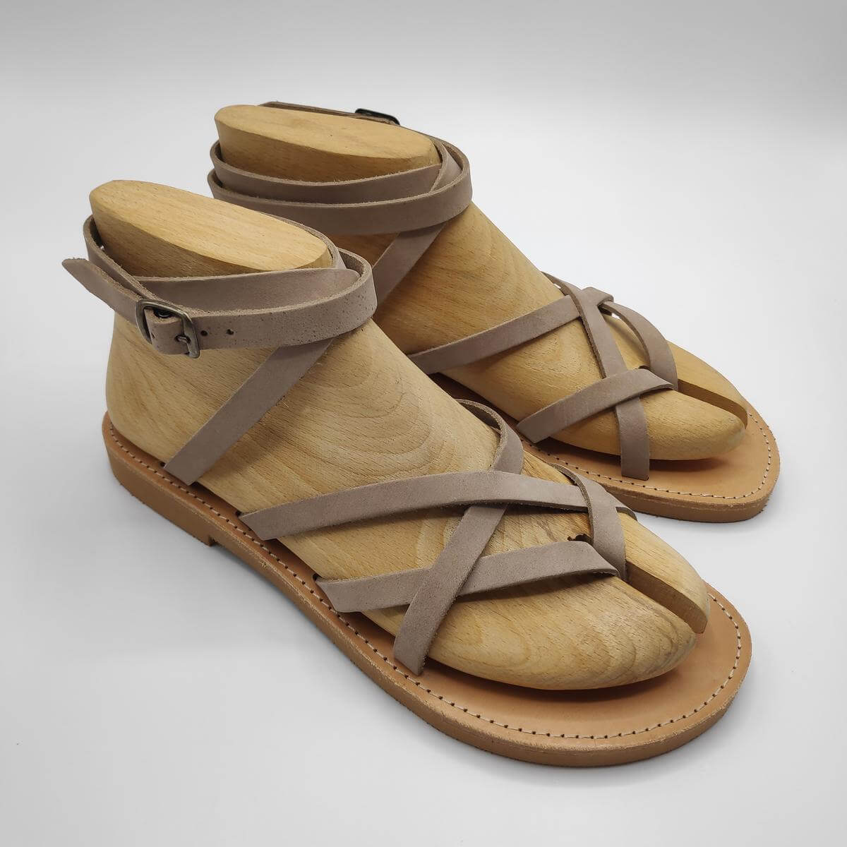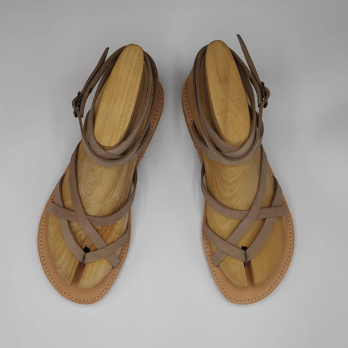 [vc_row][vc_column width=”1/3″][vc_column_text text_larger=”no”]Dimitra is our strap sandals handmade using 100% genuine leather designed with 2 criss cross straps. One as a big toe separator and another on the mid front part of the foot. The back strap of this greek sandal is a high cut ankle strap that loops around the ankle twice and is fastened using a metallic buckle. The straps are about 1 cm in width and are set on a natural leather upper sole and a beige rubber bottom sole.