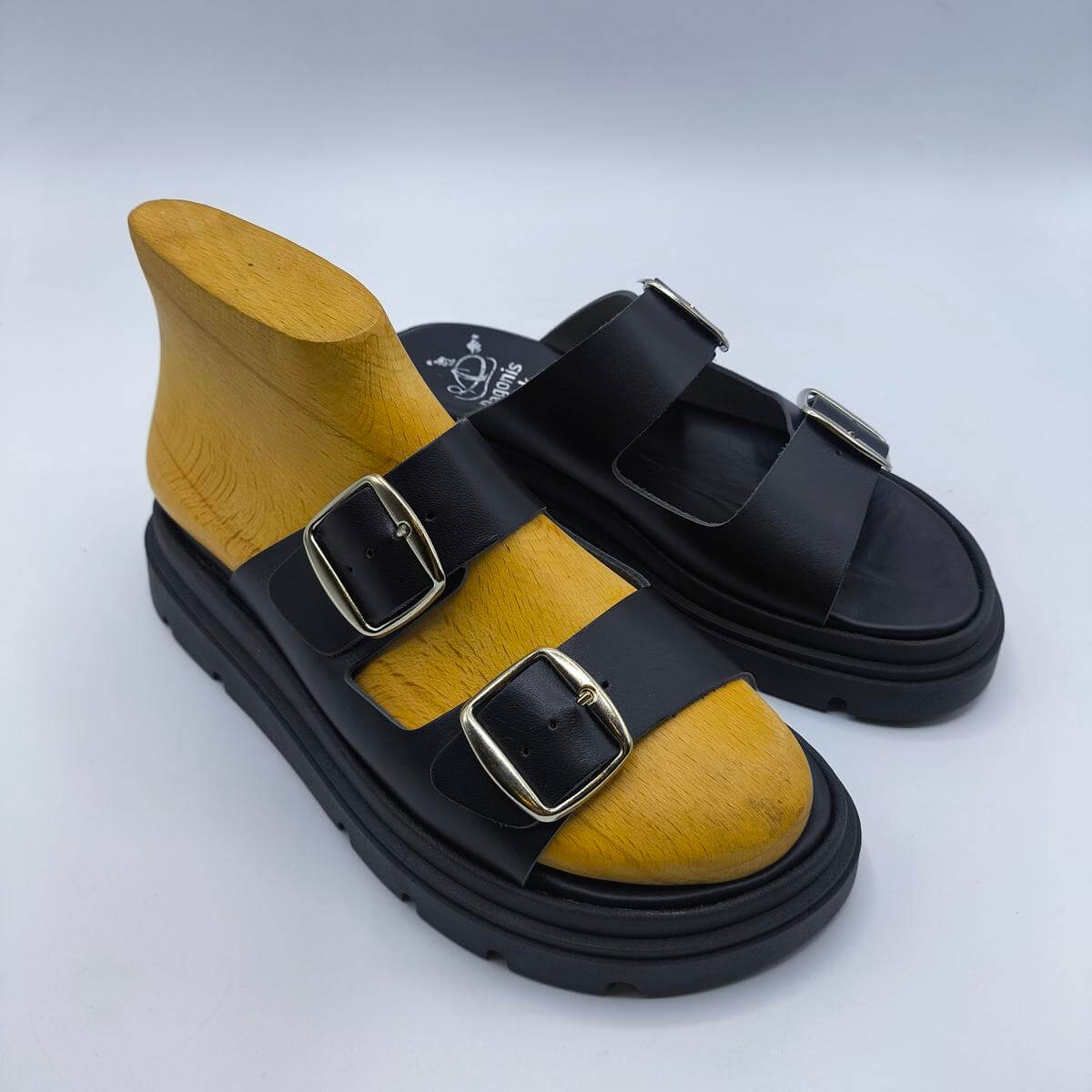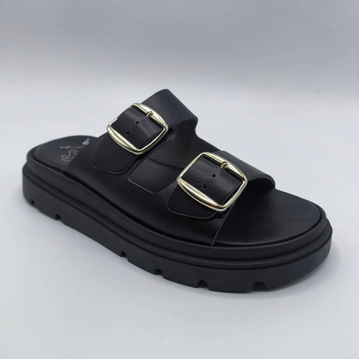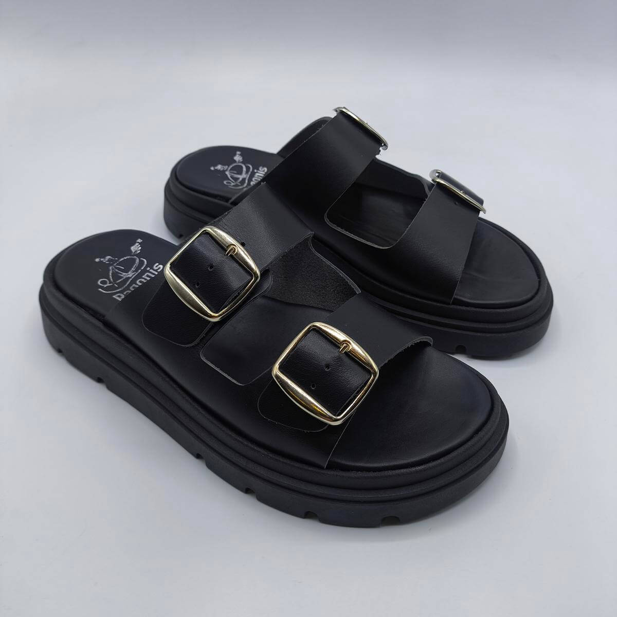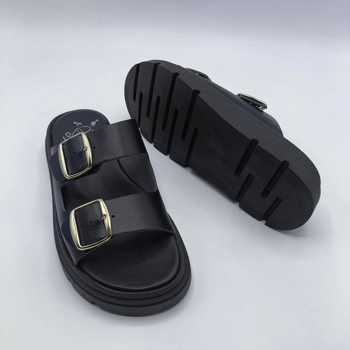 Women Total Black Two Straps Platform cut with clean lines and desirable curves straps set on a comfortable, soft upper leather sole, platform base and rubber bottom soles providing excellent durability and grip.