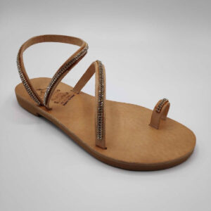 Ancient greek sandals eleftheria model or we call it Loop is designed with a toe ring, a mid feet diagonal strap and a loop strap that goes around the ankle and set on a leather upper sole and rubber bottom sole. A minimal and discreet model with a playful twist, this model is designed to be worn day to night.